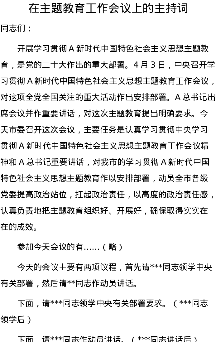 在主题教育工作会议上的主持词(特色社会主义思想)
