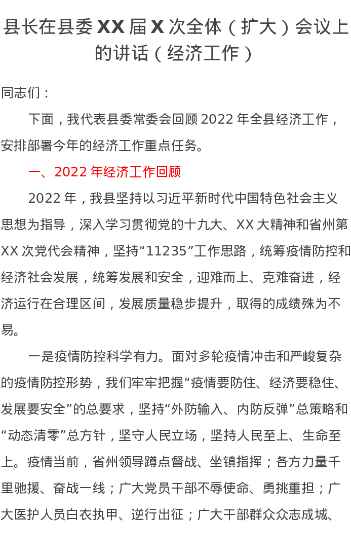 县长在县委XX届X次全体(扩大)会议上的讲话(经济工作)