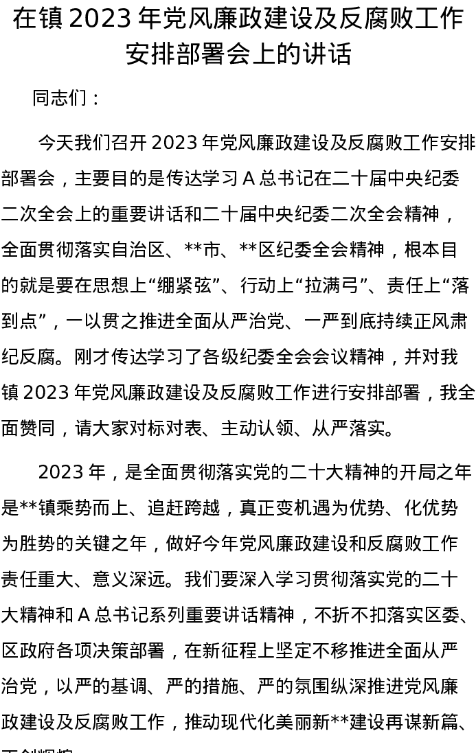 在镇2023年党风廉政建设及反腐败工作安排部署会上的讲话