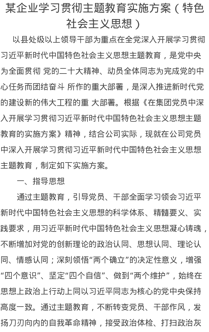 某企业学习贯彻主题教育实施方案(特色社会主义思想)