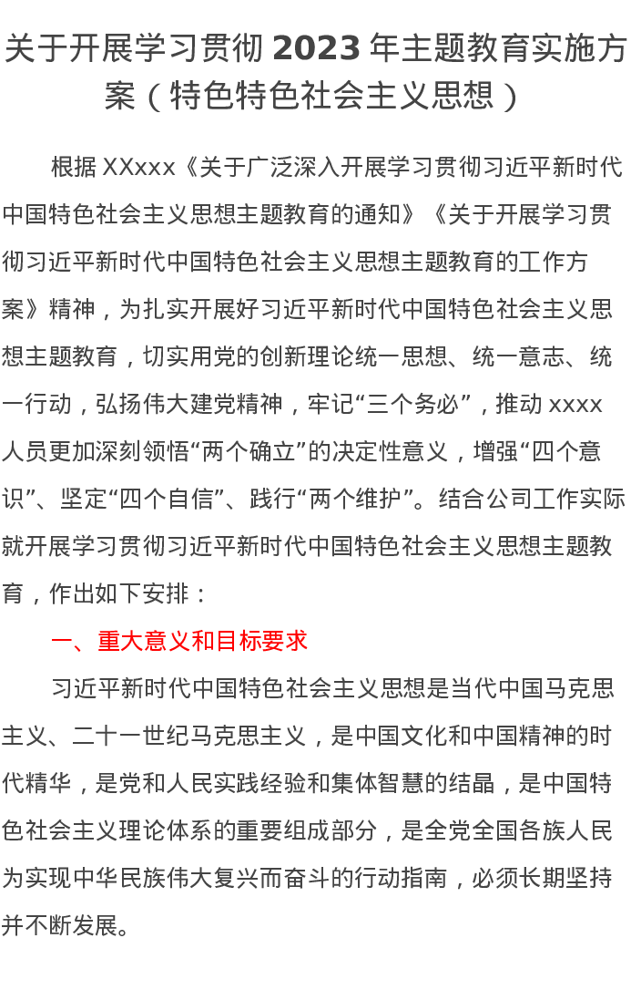 关于开展学习贯彻2023年主题教育实施方案(特色特色社会主义思想)