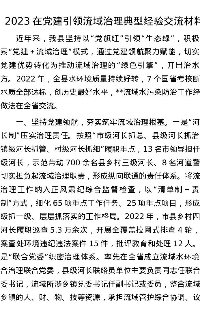 2023在党建引领流域治理典型经验交流材料