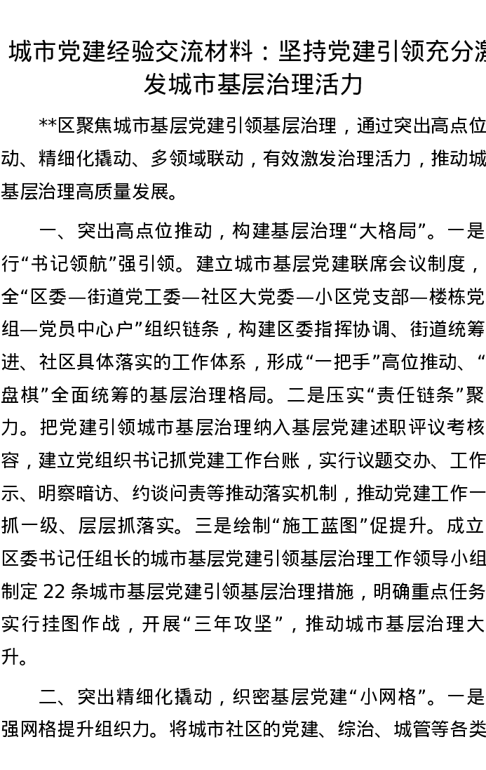 城市党建经验交流材料:坚持党建引领 充分激发城市基层治理活力