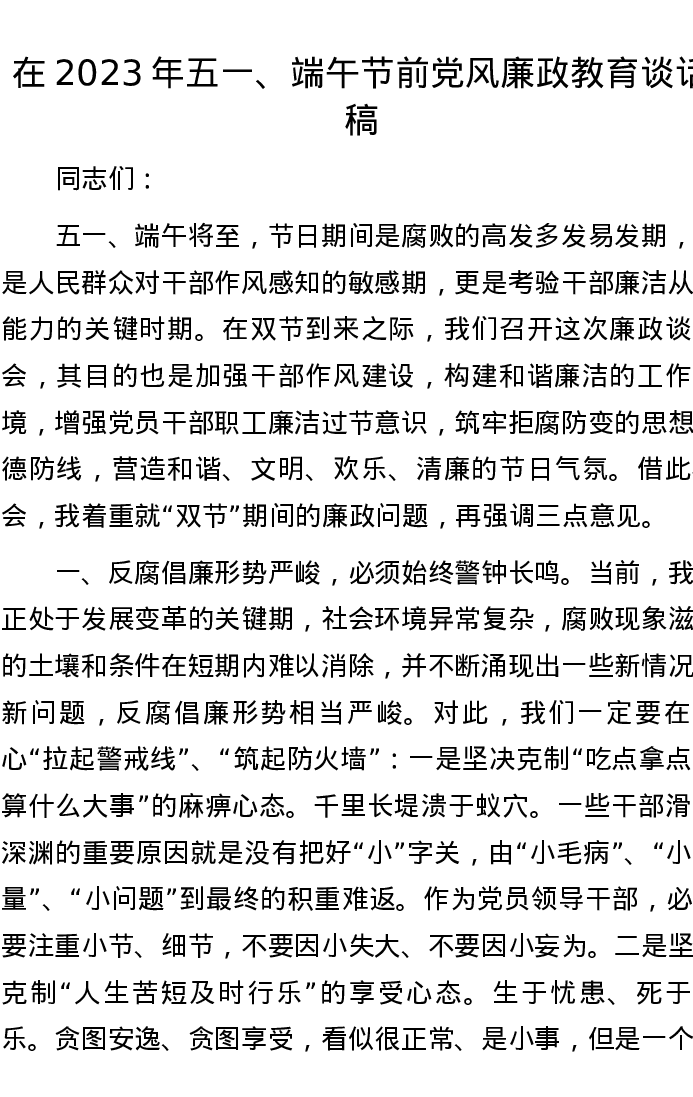 在2023年五一、端午节前党风廉政教育谈话稿