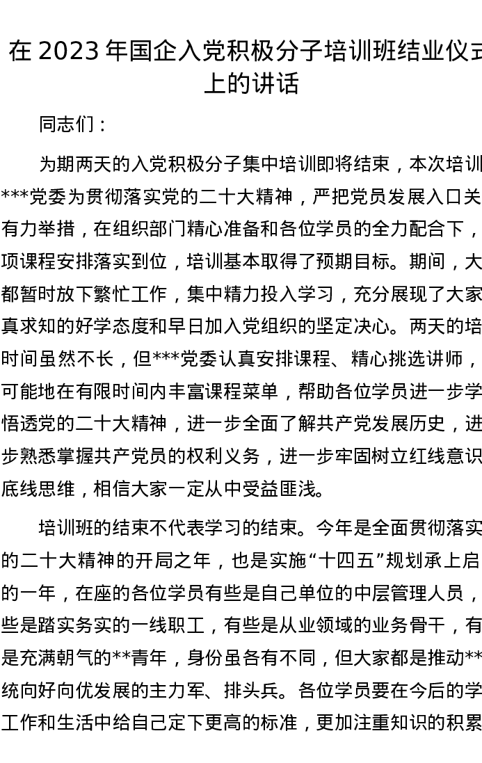 在2023年国企入党积极分子培训班结业仪式上的讲话