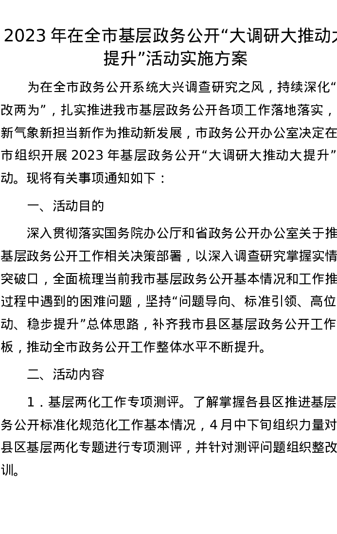2023年在全市基层政务公开“大调研大推动大提升”活动实施方案
