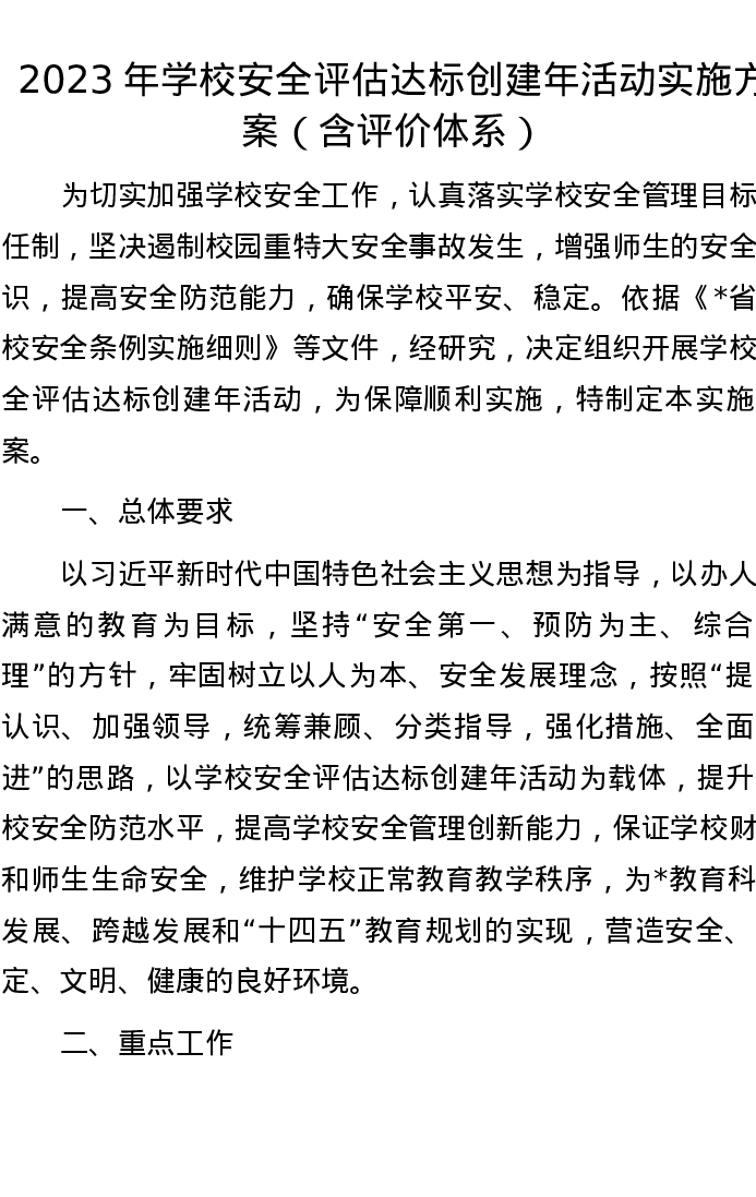 2023年学校安全评估达标创建年活动实施方案(含评价体系)