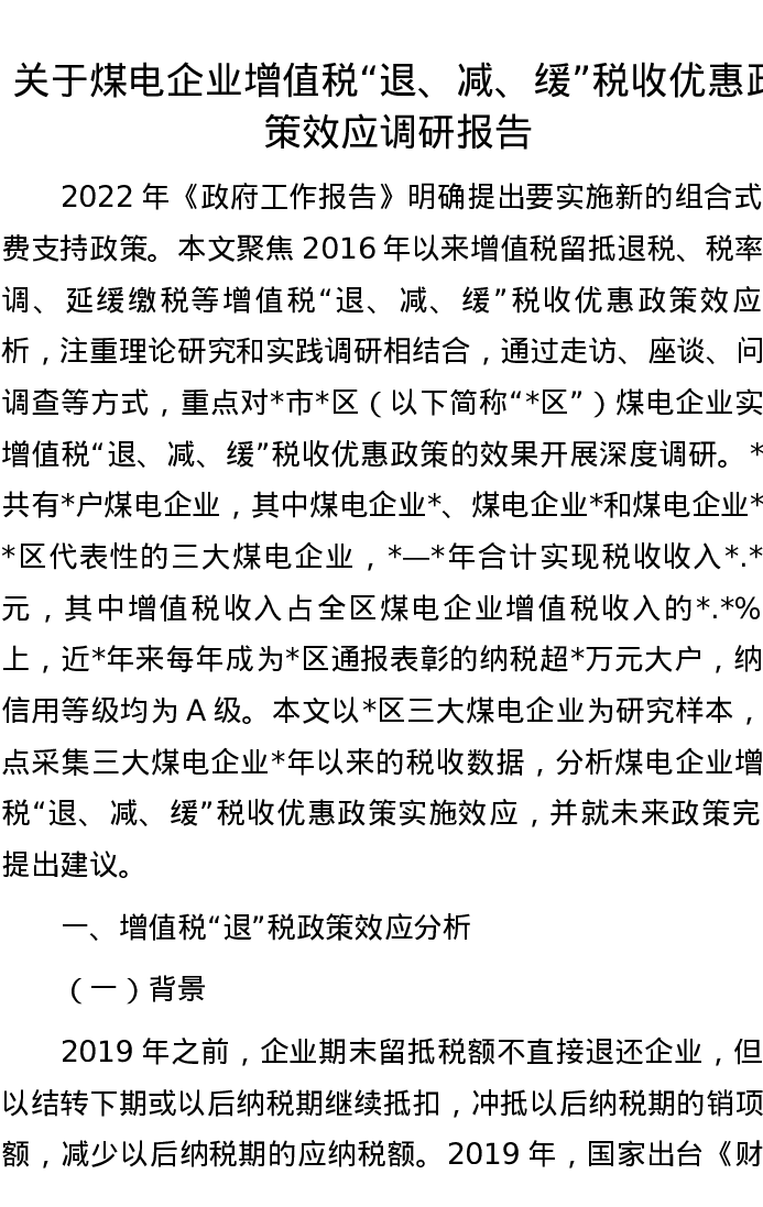 关于煤电企业增值税“退、减、缓”税收优惠政策效应调研报告