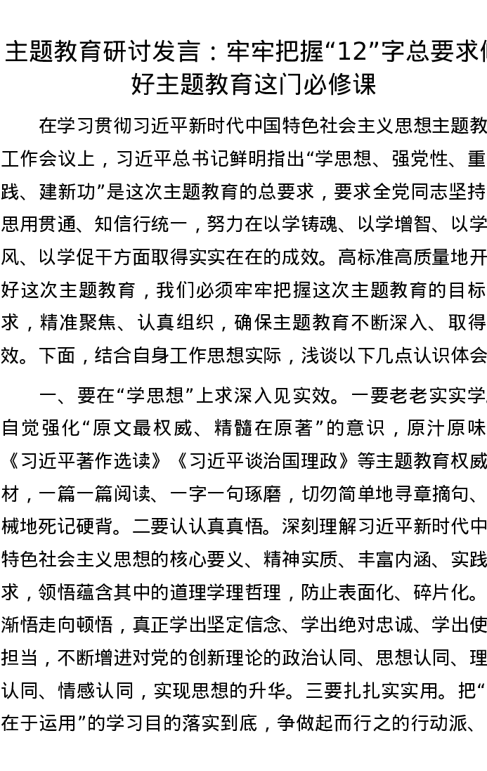 主题教育研讨发言:牢牢把握“12”字总要求 修好主题教育这门必修课