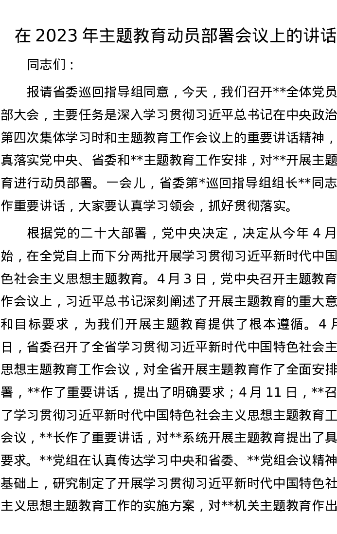 在2023年主题教育动员部署会议上的讲话