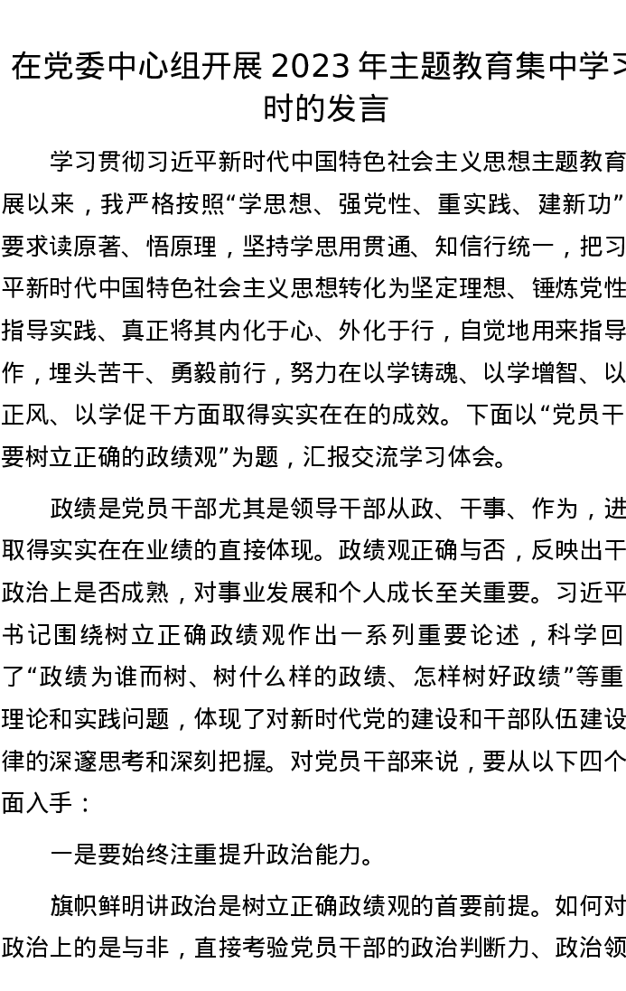 在党委中心组开展2023年主题教育集中学习时的发言