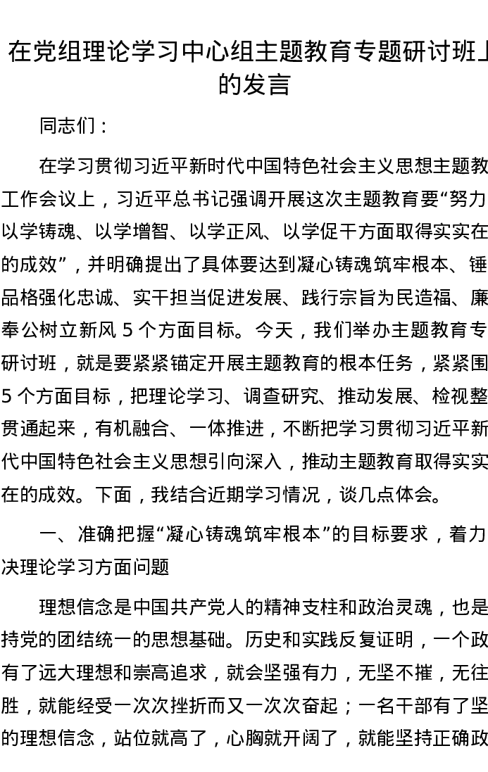 在党组理论学习中心组主题教育专题研讨班上的发言