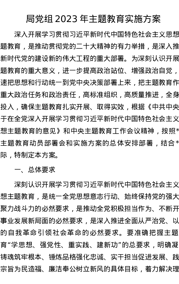 局党组2023年主题教育实施方案