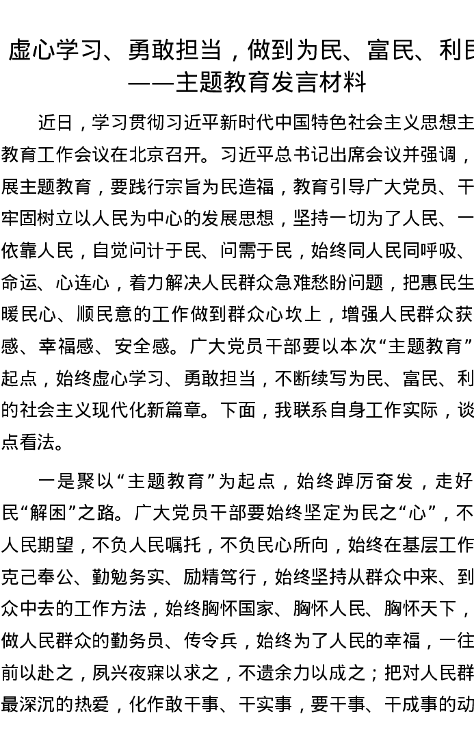 虚心学习、勇敢担当,做到为民、富民、利民——主题教育发言材料