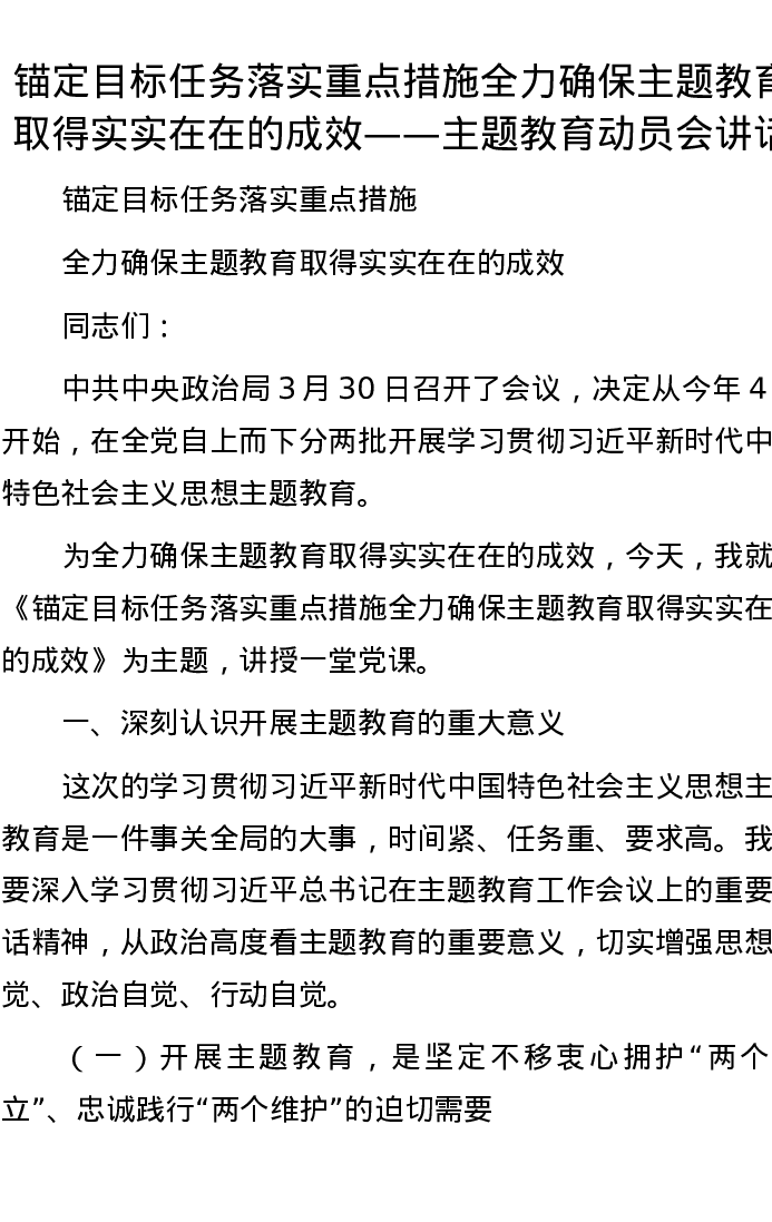 锚定目标任务 落实重点措施 全力确保主题教育取得实实在在的成效——主题教育动员会讲话