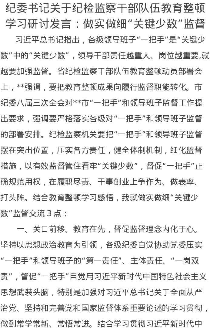 纪委书记关于纪检监察干部队伍教育整顿学习研讨发言:做实做细“关键少数”监督