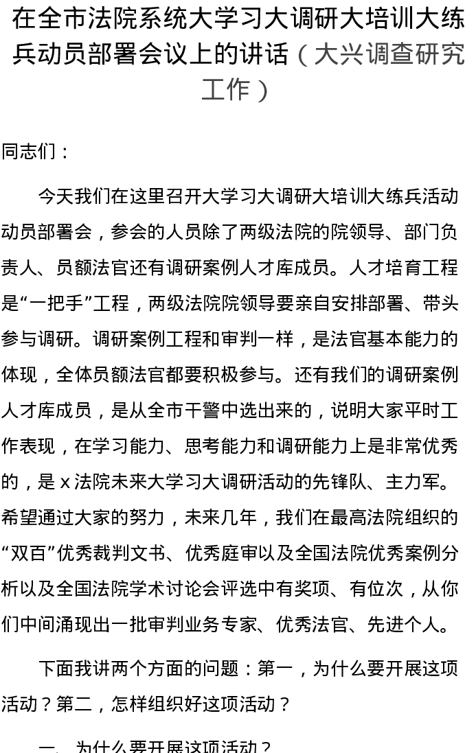 在全市法院系统大学习大调研大培训大练兵动员部署会议上的讲话(大兴调查研究工作)