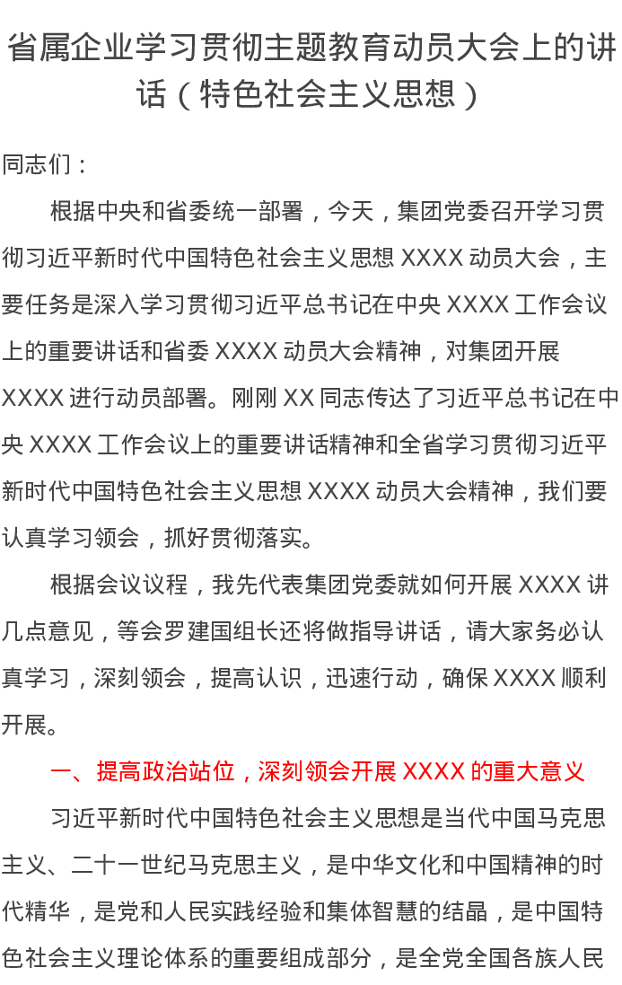 省属企业学习贯彻主题教育动员大会上的讲话(特色社会主义思想)
