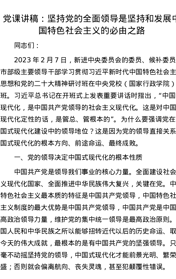 党课讲稿:坚持党的全面领导是坚持和发展中国特色社会主义的必由之路