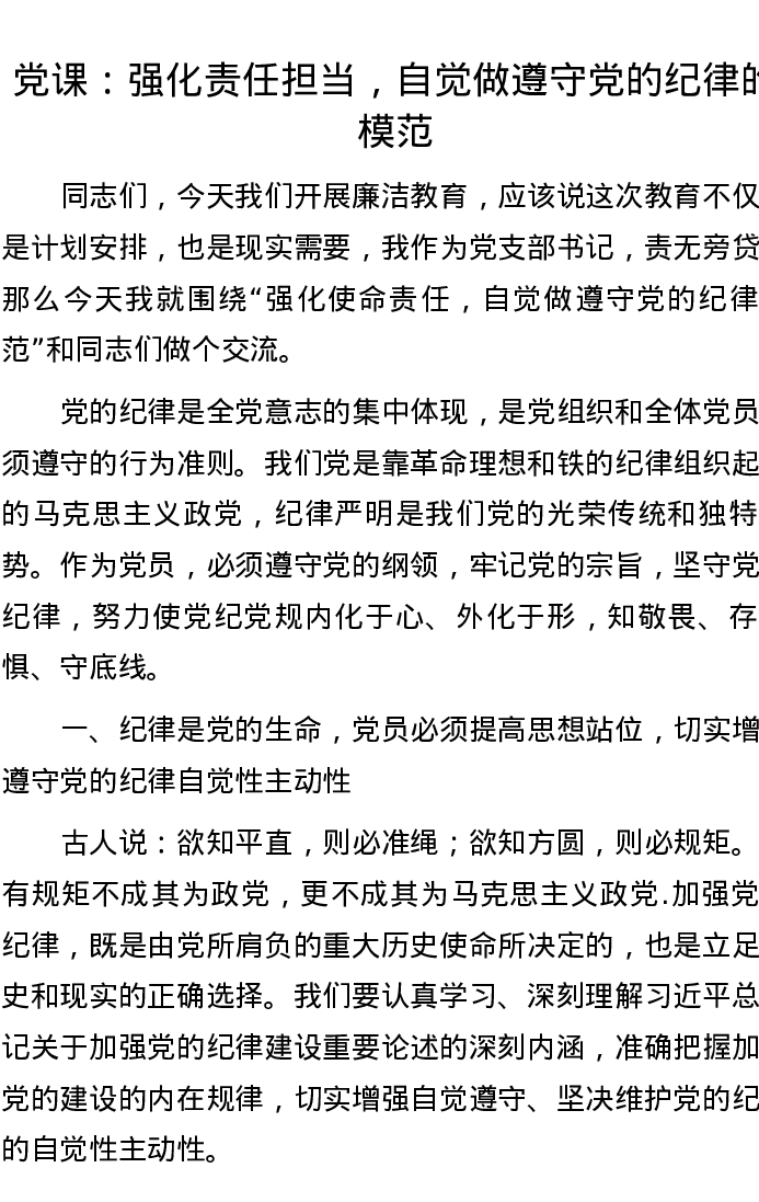 党课:强化责任担当,自觉做遵守党的纪律的模范