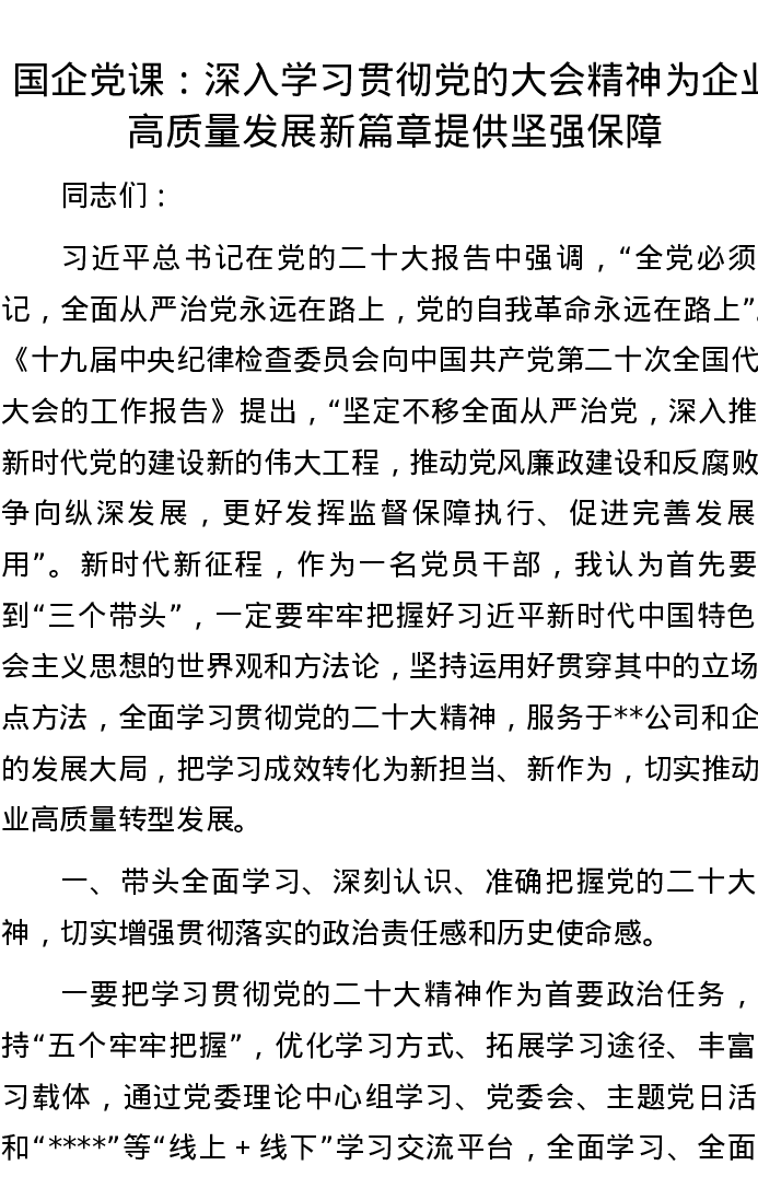 国企党课:深入学习贯彻党的大会精神 为企业高质量发展新篇章提供坚强保障