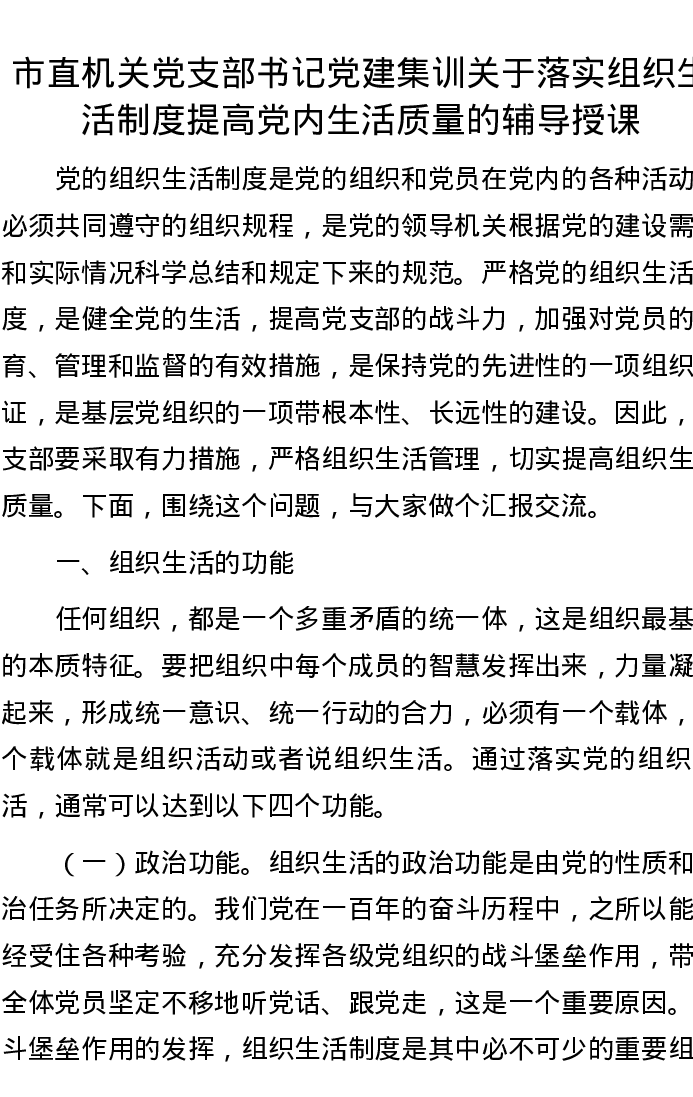 市直机关党支部书记党建集训关于落实组织生活制度提高党内生活质量的辅导授课
