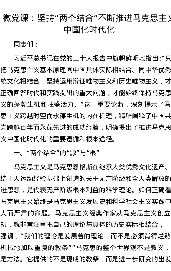 微党课:坚持“两个结合” 不断推进马克思主义中国化时代化