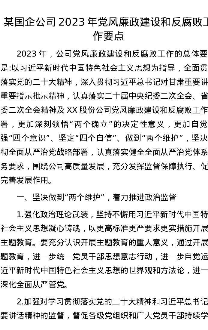 某国企公司2023年党风廉政建设和反腐败工作要点