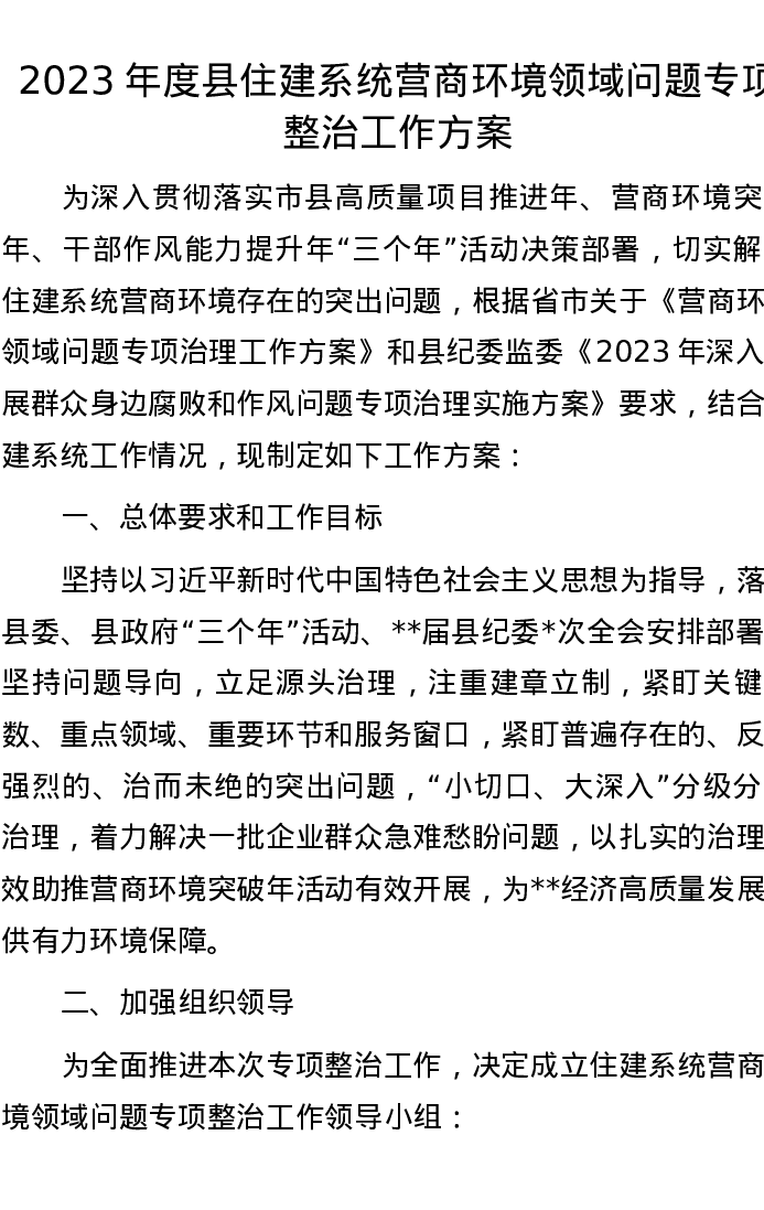 2023年度县住建系统营商环境领域问题专项整治工作方案