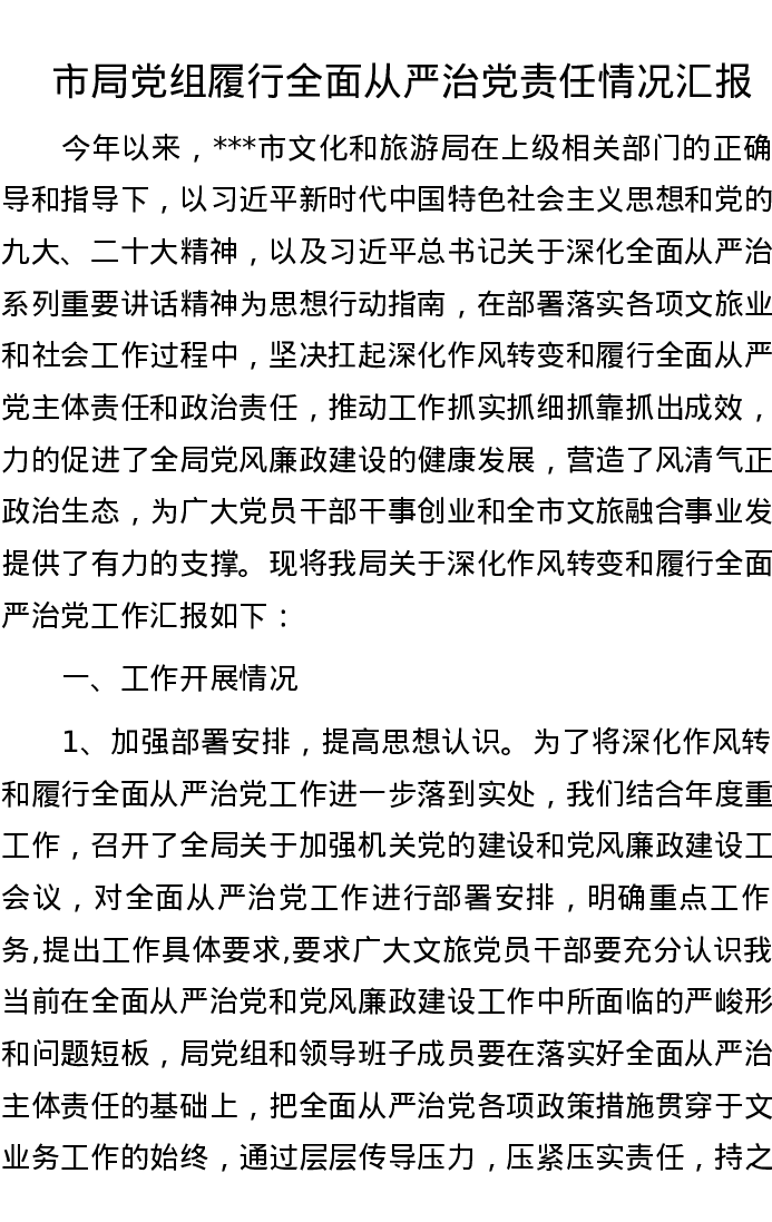市局党组履行全面从严治党责任情况汇报