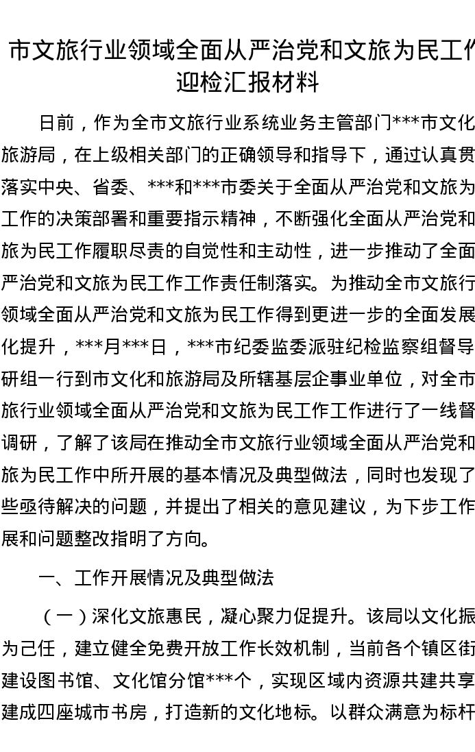 市文旅行业领域全面从严治党和文旅为民工作迎检汇报材料