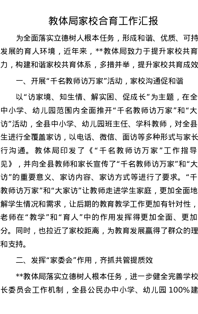 教体局家校合育工作汇报