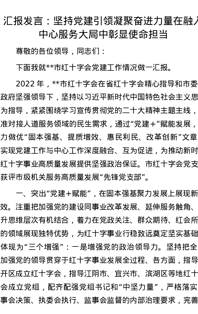 汇报发言:坚持党建引领 凝聚奋进力量 在融入中心服务大局中彰显使命担当