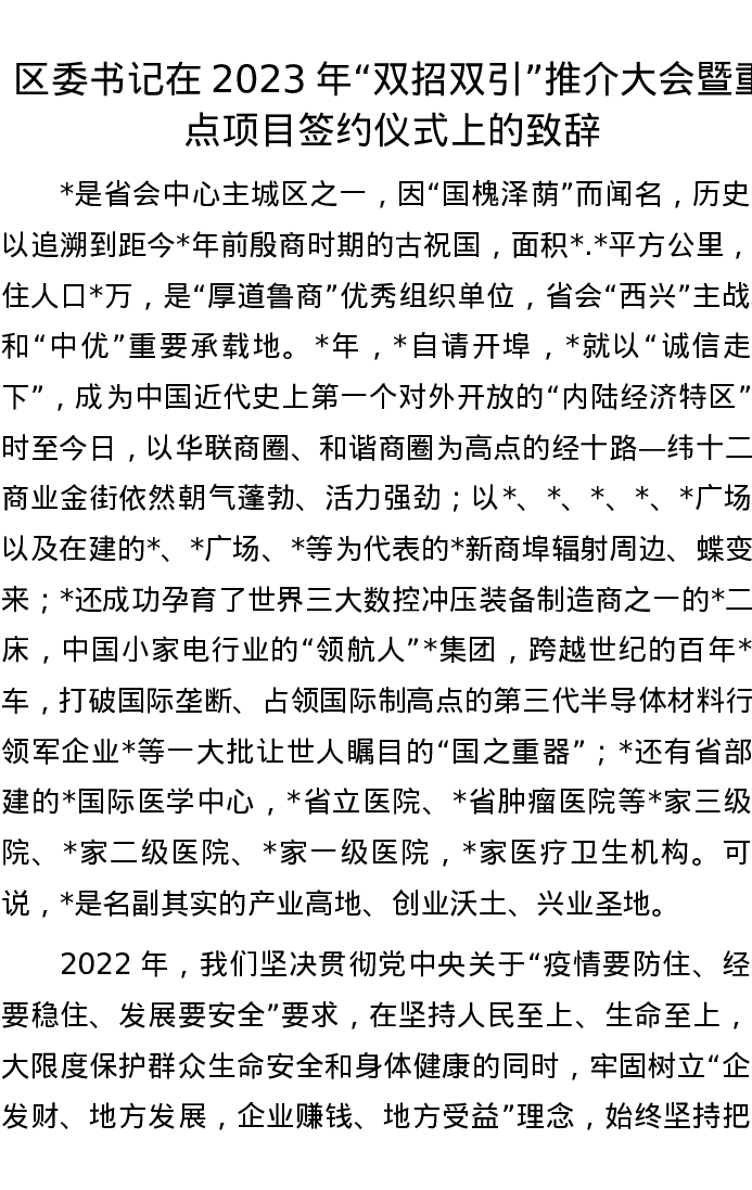 区委书记在2023年“双招双引”推介大会暨重点项目签约仪式上的致辞