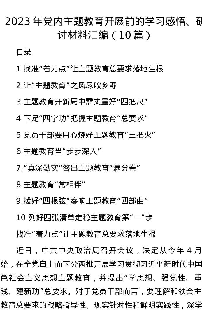 2023年党内主题教育开展前的学习感悟、研讨材料汇编(10篇)
