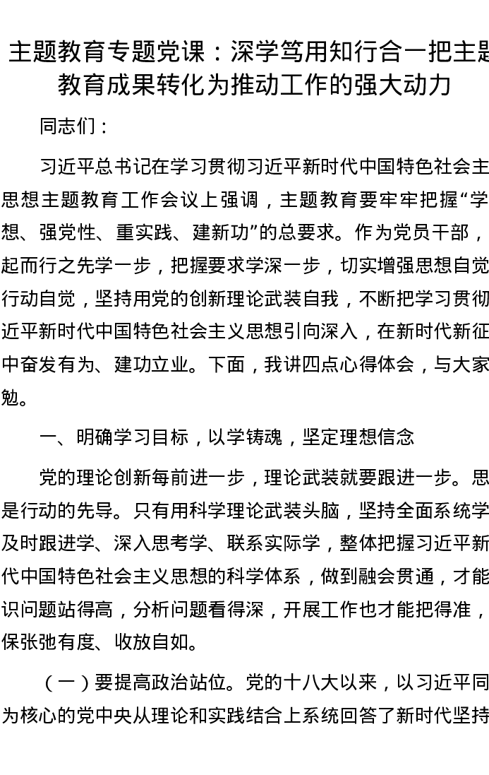 主题教育专题党课:深学笃用 知行合一 把主题教育成果转化为推动工作的强大动力