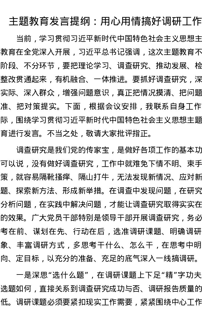 主题教育发言提纲 : 用心用情搞好调研工作