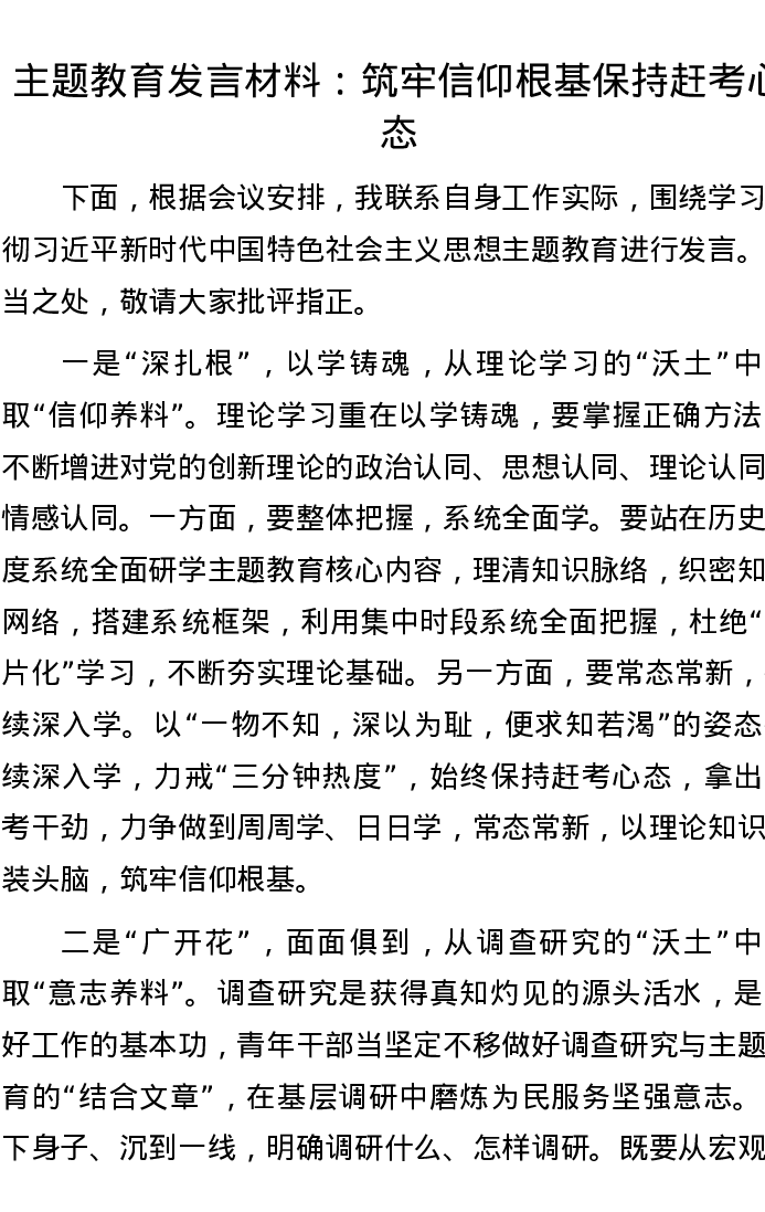 主题教育发言材料:筑牢信仰根基 保持赶考心态