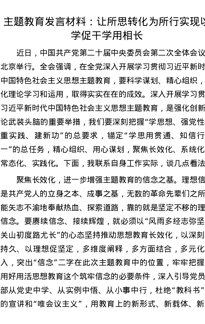 主题教育发言材料:让所思转化为所行 实现以学促干学用相长