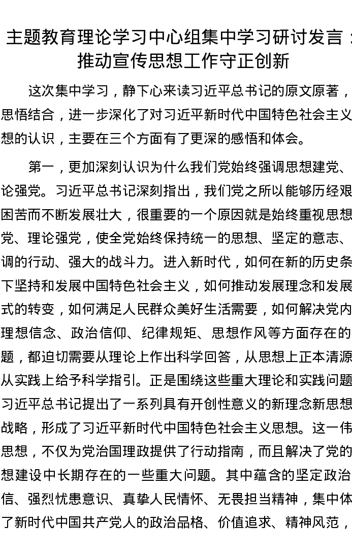 主题教育理论学习中心组集中学习研讨发言: 推动宣传思想工作守正创新