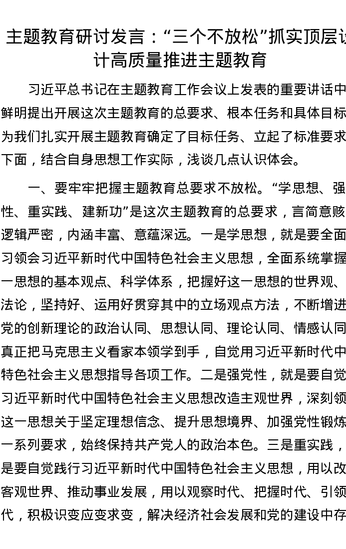 主题教育研讨发言:“三个不放松”抓实顶层设计 高质量推进主题教育