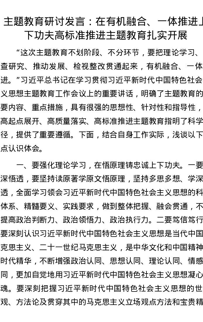 主题教育研讨发言:在有机融合、一体推进上下功夫 高标准推进主题教育扎实开展