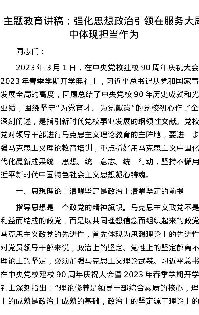 主题教育讲稿:强化思想政治引领 在服务大局中体现担当作为