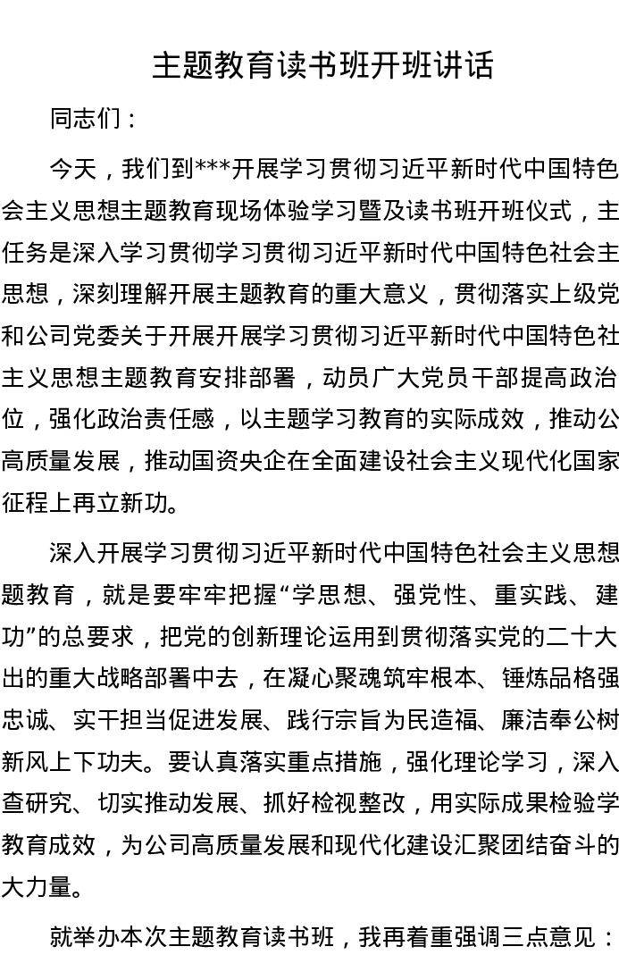 主题教育读书班开班讲话