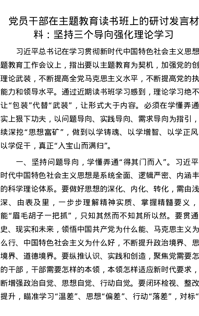 党员干部在主题教育读书班上的研讨发言材料:坚持三个导向 强化理论学习