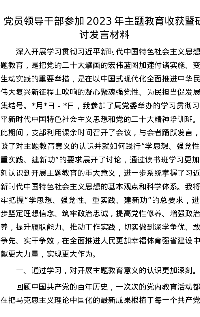 党员领导干部参加2023年主题教育收获暨研讨发言材料