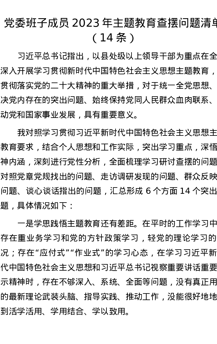 党委班子成员2023年主题教育查摆问题清单(14条)