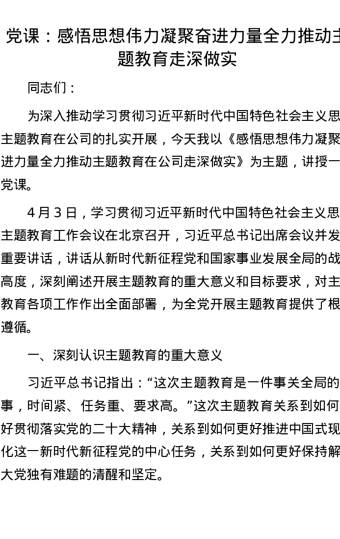 党课:感悟思想伟力 凝聚奋进力量 全力推动主题教育走深做实
