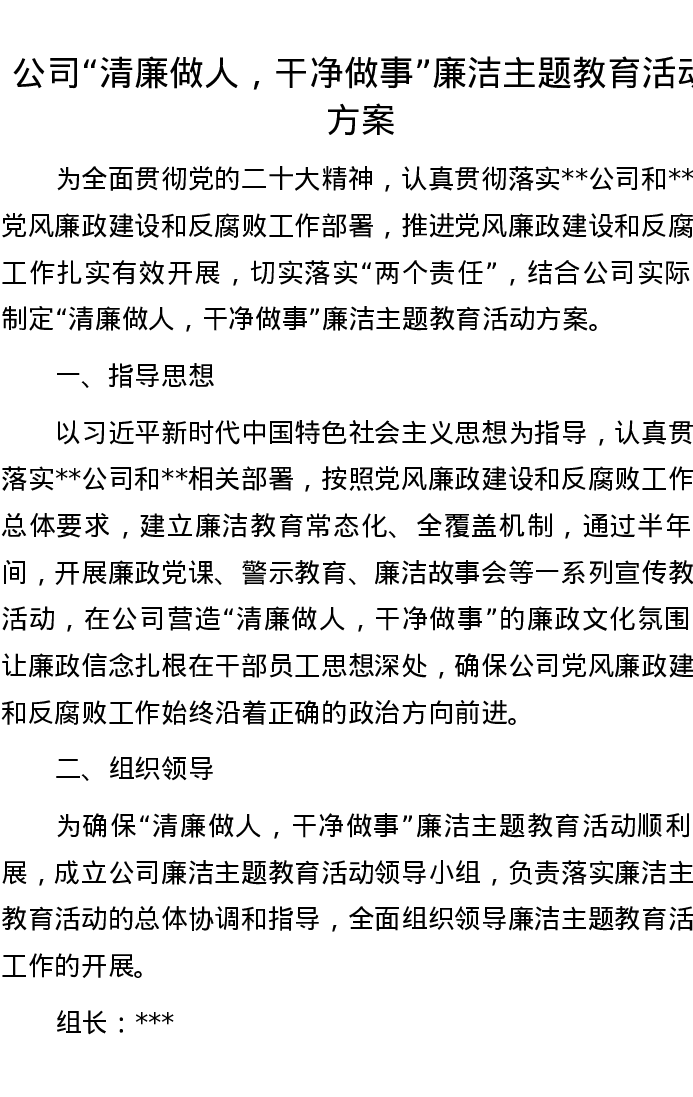 公司“清廉做人,干净做事”廉洁主题教育活动方案