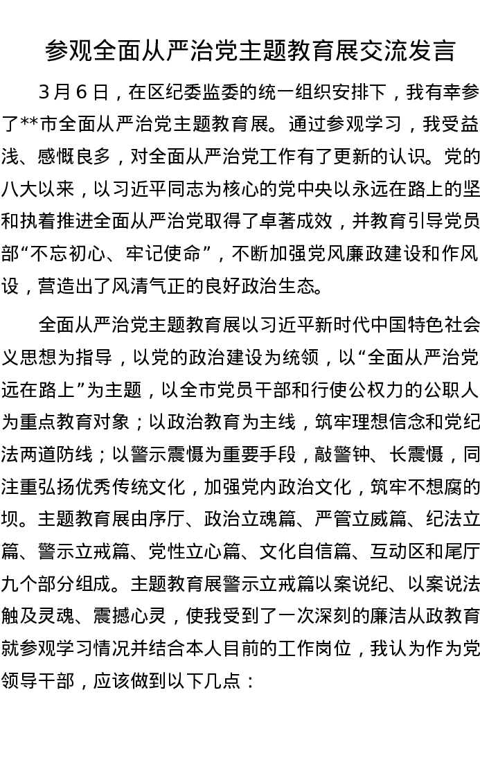 参观全面从严治党主题教育展交流发言